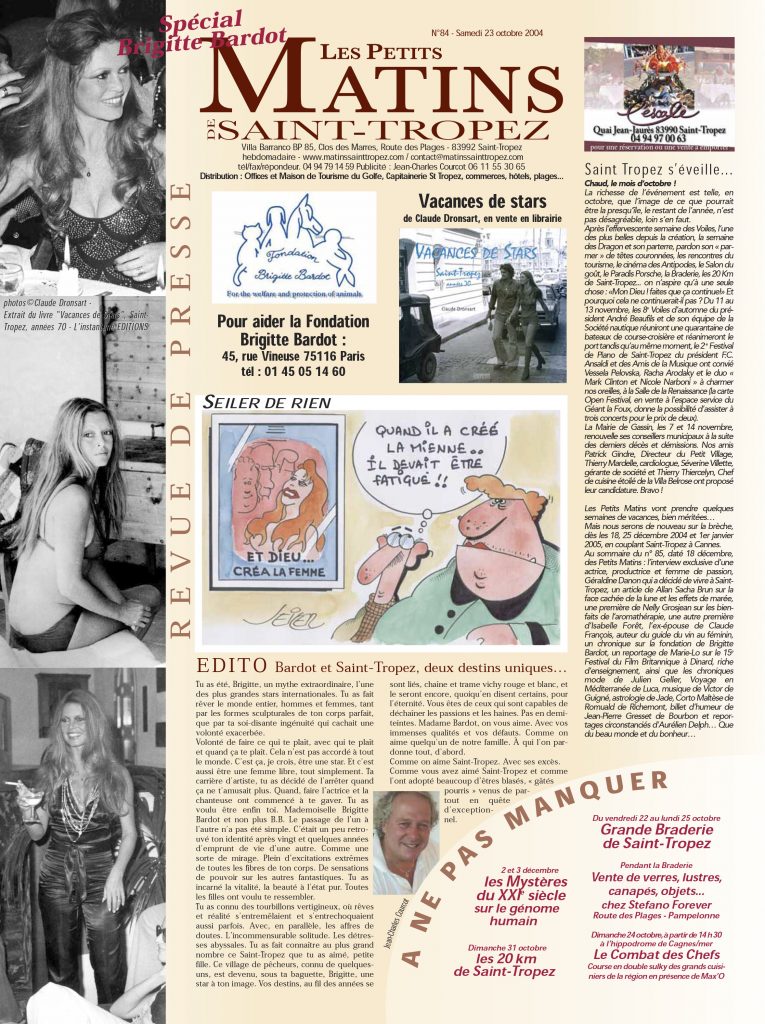 Co-fondation des Editions Arts & Îles – Edition du journal hebdomadaire Les Petits Matins de Saint-Tropez, (130 numéros) (quadrichromie, 100 g demi-mat, diffusion à 10.000 ex.) – Edition du magazine bi annuel Les Cahiers des Petits Matins (6 numéros) (quadrichromie, couverture 170 g, pages intérieures 100 g demi-mat, diffusion à 10.000 ex.)