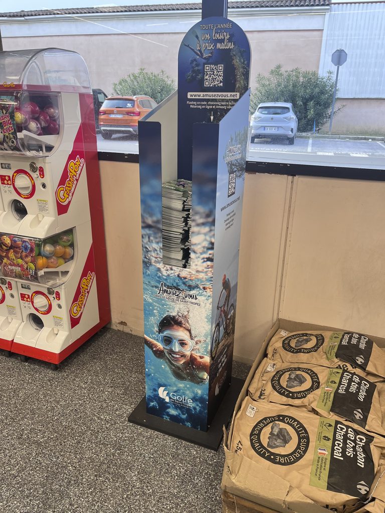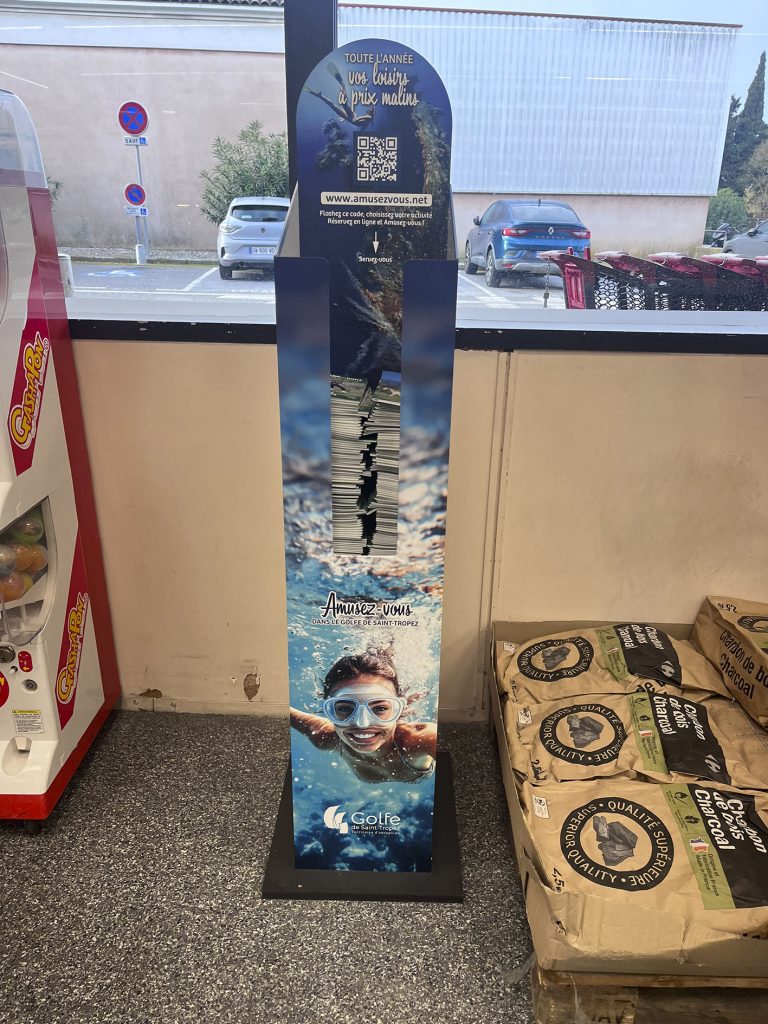 PLV pour Golfe Saint-Tropez Tourisme pour déposer les brochures Amusez-vous dans les grandes surfaces et alimentations du Golfe. Fabrication locale en dibon, vinyle et PVC.
